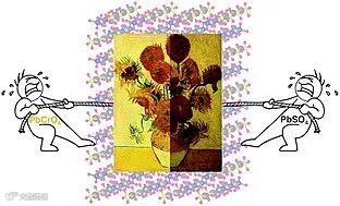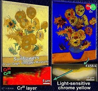 铬黄(chrome yellow)颜料的主要成分是铬酸铅PbCrO4,由于制作工艺的不同还掺有部分硫酸铅,它色彩鲜艳明亮饱含激情,深受梵高的钟爱,并被大量应用在“Sunflowers”等世界名画的创作上。分析发现铬黄变暗是由于CrⅥ-CrⅢ的光还原,这种变化甚至能深达画面约3~5 μm厚,甚至在表面形成微粒。