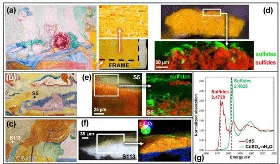 图2. 镉黄颜料褪色的画作及分析。图片来源:Angew. Chem. Int. Ed.