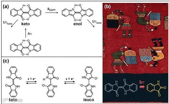 靛蓝颜料具有迷人的蓝色,成分的分子量相对较小,其发色团往往用供体-受体理论来解释,即靛蓝中的氨基作为电子供体,而羧基作为电子受体。靛蓝分子内的光物理学机制可以使其在被光照时失活99.99%的光子,有效地保护靛蓝不发生化学反应。在合适的条件下靛蓝光降解的量子产率低于10-6,约公元前100年前后的安第斯纺织品中仍然可以发现它们,不过在氧自由基或还原物种等不利条件下,光降解的量子产率上升至10-4-10-3。研究还表明,靛蓝分子中间的双键起到光保护作用的同时,也是个光降解的弱点,靛蓝的主要光降解产物为靛红(isatin),但含量较低,在10%-20%。靛蓝的另一个结构特点是两个相邻的羰基和N-H存在分子内氢键,使分子保持反式平面构型,阻止了光化学顺反异构,后者会造成不可逆转的光化学褪色。此外,靛蓝的颜色稳定机理也适用于另外两种重要的历史染料——玛雅蓝(Maya blue)和泰尔紫(Tyrian purple)。
