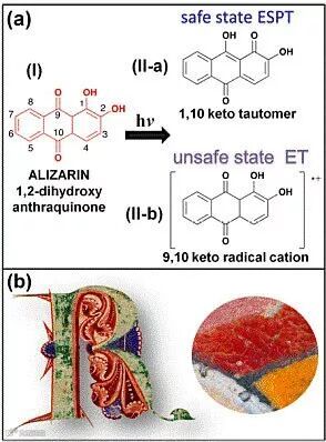 蒽醌红是历史上最常用的红色植物颜料,从茜草科植物的根部提取,可以和铝盐混合制成颜料。因这些茜草颜料的确切结构目前仍有争论,研究者聚焦在茜素(alizarin)和红紫素(purpurin)的光稳定性上。如图7a所示,茜素(I)在光照作用下有两种光转化途径,产物IIa通过激发态质子转移(ESPT),由1,2-二羟基蒽醌转化为1,10酮式互变异构体,不会变色;IIb则发生电子转移(ET),由1,2-二羟基蒽醌不可逆转地氧化为9,10酮式自由基阳离子,导致褪色。两种途径动态竞争,前者比后者至少多2个数量级。蒽醌红的良好稳定性使我们仍可以看到几个世纪前画作的红色,如图7b所示12世纪的画作,蒽醌红颜料还能完好如初,而旁边基于铜的绿色已近消失殆尽。