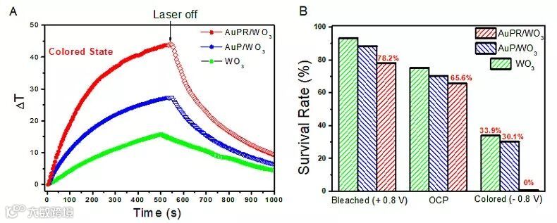 近红外光照射300秒,覆盖了该电致变色薄膜的玻璃(直径5 mm)可以使3 mL水的温度升高36.9 ℃,照射500秒时水温升高43.2 ℃。复合物膜的表面温度在短时间内迅速升高,局部高温使覆盖了该涂层材料的“smart window”具有优异的抑菌能力。有鉴于该电致变色薄膜可调控的光热性能,该材料有望成为一种可供热的新型玻璃材料用于飞机和寒冷地区医院等公共场所的窗户,为航空器和高纬度地区的建筑物提供热能,并有效降低一些通过接触造成感染的细菌型疾病传播的风险。
