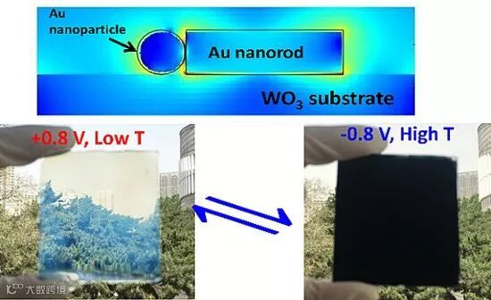 近日,东北大学化学系的宋焱焱教授团队和南京大学工学院的张勇教授团队、化学化工学院的夏兴华教授团队合作,在传统“smart window”上实现了电致变色-光热双功能调控。该工作将Au纳米棒与Au纳米粒子形成的“火柴”纳米结构与传统电致变色材料WO3薄膜结合,通过电致变色实现了对光热效率的有效调控。该研究发现,在WO3电致变色的过程中,Au-LSPR吸收峰的强度和位置也随之变化;处于着色态的多孔WO3薄膜在较宽的光谱范围内具有更好的吸光效果,增强的无辐射等离子体衰减使光线进一步限制在纳米级的WO3蜂巢状结构中。以上两方面原因使处于着色状态的“smart window”具有优异的光热转化性能。