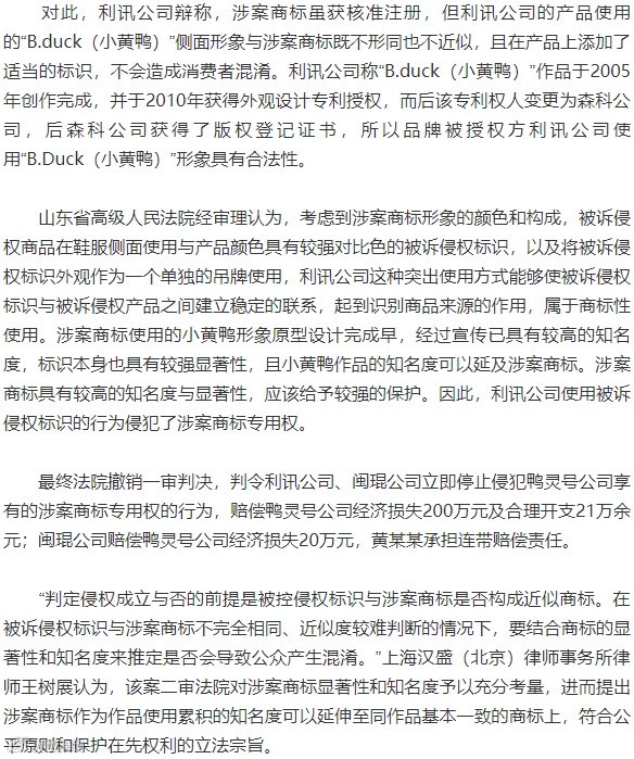 鸭灵号公司不服一审判决结果,继而向山东省高级人民法院提起上诉,称“B.Duck(小黄鸭)”作品权利人森科产品有限公司(下称森科公司)不断摹仿林亮添先生、得意公司有关作品、商标,森科公司及其品牌授权使用方利讯公司在明知得意公司拥有涉案商标的情况下,非但不进行避让,而是将其所谓享有在先著作权作品的“站立鸭”形象改为与涉案商标相同的侧面“浮水鸭”形象进行商标性使用,易造成消费者的混淆,侵权恶意明显,故请求依法撤销一审判决,改判支持其一审诉求。