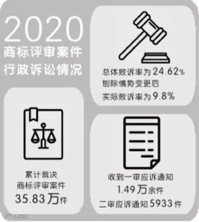 2020年,累计裁决商标评审案件35.83万件,共收到一审应诉通知1.49万余件、二审应诉通知5933件,总体败诉率为24.62%,刨除情势变更后的实际败诉率则仅为9.8%,与2019年13.9%的实际败诉率相比出现明显下降……近日,国家知识产权局发布的2020年商标评审案件行政诉讼情况显示,2020年商标评审案件的一审被诉率稳中有降,败诉率明显下降,商标评审部门和法院在法律适用标准上日趋稳定和统一,商标评审程序不仅在案件数量上充当了“减压阀”,在法律适用标准统一方面也发挥了承上启下的沟通作用。
