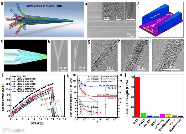 图1. 超长碳纳米管管束的结构制备及力学性能。a. 碳纳米管管束示意图;b. 所用到的超长碳纳米管的结构;c. 利用气流聚焦法制备超长碳纳米管管束的示意图;d. 超长碳纳米管在聚焦气流下发生合并的模拟图;e-i. 所制备的具有确定组成的超长碳纳米管管束;j-k. 所制备的碳纳米管管束的力学性质;l. 超长碳纳米管管束与其他材料拉伸强度对比图。
