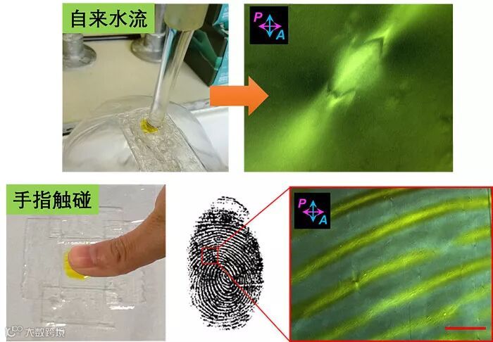 研究人员首先通过重组蛋白技术合成了超电荷的非折叠蛋白分子,然后通过静电作用力在侧链引入偶氮苯官能团。该蛋白复合物在水相中发生相分离,形成富含水的橙红色流体。在施加一系列不同环境中的微弱剪切力后,该流体分子的内部结构从无序到向列型取向的转变非常灵敏(图1)。他们通过深入研究发现,侧链修饰的偶氮苯基团对稳定蛋白流体的液晶结构起到重要的作用。大自然中剪切力无处不在,如研究人员发现水的冲刷剪切也会导致流体材料的相转变(图2),并且不同的水流速会产生不同大小的双折射区域,因此通过量化双折射就可以检测外界环境中剪切力的强弱。手指尖触碰该生物流体材料会产生基于指纹图案的双折射纹理(图2)。换言之,手指指纹的细枝末节、隆起以及线条等各类细节都能完好地通过双折射图谱展现并存储起来。该类工程化蛋白流体材料有望用于记录、展示生物微观识别和图谱信息,其研究成果自发表以来迅速得到国际科技媒体的广泛关注和报道,美国的ScienceDaily、欧洲的ChemViews Magazine、Chemie.de、Analytica-world等均对该成果进行了专题报道。