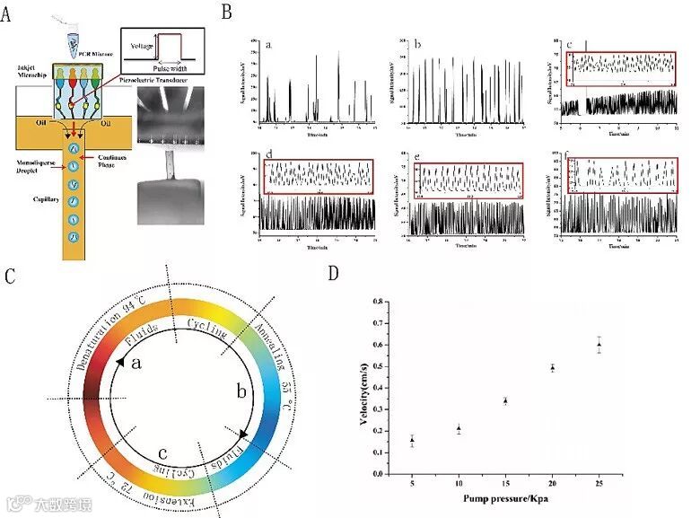 图2.(A)喷墨打印液滴技术的示意图;(B)液滴进样频率对液滴间荧光信号分辨率的影响;(C)PCR循环扩增的示意图;(D)液滴的运转速率。