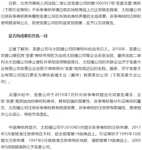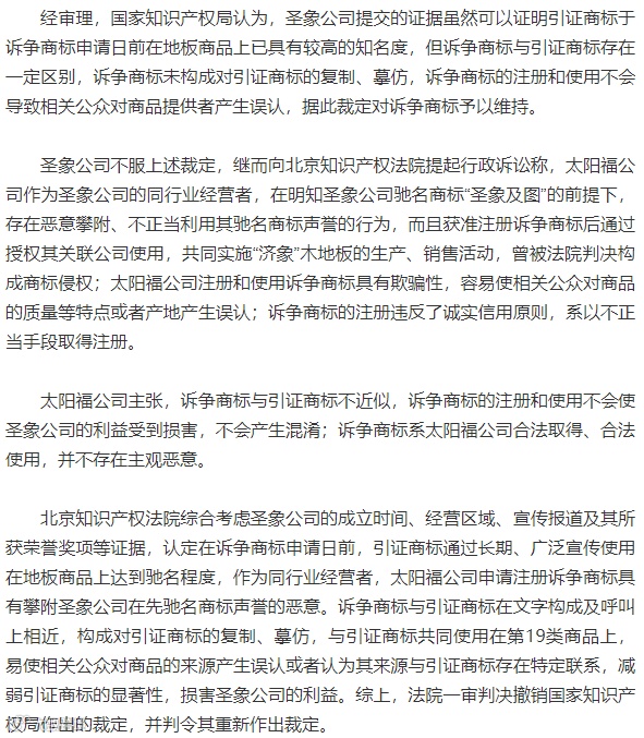 太阳福公司不服一审判决,向北京市高级人民法院提起上诉,主张一审法院未能按照传票通知时间按时通过线上开庭的方式进行庭审,径行作出判决,剥夺了其参加庭审的权利,违反法定程序;圣象公司的起诉时间超过法定期限,而且太阳福公司注册诉争商标并不具有恶意。