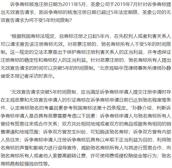 “根据我国商标法规定,自商标注册之日起5年内,在先权利人或者利害关系人可以请求宣告该注册商标无效。对恶意注册的,驰名商标所有人不受5年的时间限制。这一规定的立法本意是出于保护商标注册利害关系人的正当利益,并考虑保证注册商标的稳定性和商标权人的正当利益。针对恶意注册的,驰名商标所有人提出无效宣告请求的时间可以突破5年的时间限制。”北京观韬中茂律师事务所律师孙静接受本报记者采访时表示。