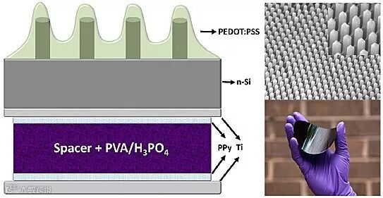 在这一发电和储能的集成器件中,电容器不仅起到储存能量的作用,更可以将不稳定输入的光电流以恒定的电压放出,使其更接近于实际应用。对太阳能电池中硅片的表面处理也是整个器件能够实现高效率的原因,他们通过蚀刻的方法将硅的表面修饰为硅纳米线阵列,再通过甲基化使得到的纳米线间隔更大、更光滑,提升了传输层PEDOT:PSS的附着效果。太阳能电池和超级电容器之所以能够整合为一个高效的单元,除了使用本身性能优异的电池和电容以外,还在于两者没有使用任何外部连接的方式,而是在硅片背面蒸镀了一个Ti电极作为两者的共用电极,大大降低了能量的损耗。研究人员还尝试将这一复合能量单元制备成为柔性器件,通过减小硅片的厚度,成功得到具备一定弯折性的器件。虽然随着硅片厚度的下降,整体效率也有所下降,但器件本身依旧能够提供稳定的输出电压,为相关研究开辟了新的方向,下图为该器件的结构示意图及其柔性测试。