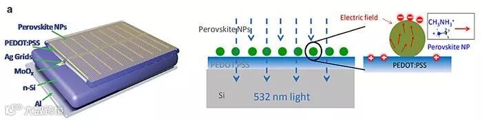 该工作制备了一种异质结太阳能电池,硅和PEDOT:PSS之间形成肖特基势垒。钙钛矿纳米颗粒中的CH3NH3+-I-偶极子可以自由旋转。当钙钛矿纳米颗粒与光子发生相互作用时,偶极子有序排列,形成光致极化电场,增加了PEDOT:PSS的功函数和肖特基势垒的高度,从而增强耗尽层中的电场,最终帮助电子的收集。相关工作发表在Advanced Materials 杂志(Adv. Mater., 2017, 29, 1606370)上。