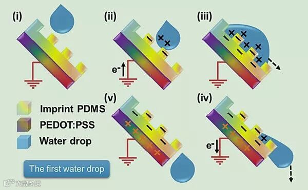 多雨天气不利于硅电池对能量的吸收,为了成功实现雨天能量的收集,刘玉强等人与孙旭辉课题组合作,开发了一种既可以在晴天通过硅太阳能电池发电,又可以在雨天通过雨滴摩擦纳米发电机进行发电的装置。该工作采用一种导电率很高的高分子聚合物水溶液(PEDOT:PSS)制备出该装置的共同电极薄膜,太阳能电池和“摩擦纳米发电机”通过共同电极集成为一体。这一设计更加简单,大大提高了输出效率。摩擦层采用透明的高分子薄膜聚二甲基硅氧烷(PDMS),因此几乎不会对太阳光的入射产生影响,所以基本不影响太阳能在晴天的正常工作。下雨时,水滴与作为摩擦层的PDMS摩擦带电,如下图1所示。共同电极薄膜作为电荷感应层感应并导出电荷。