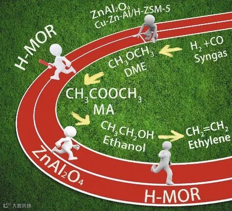 图1. 合成气通过可控接力催化直接制备乙酸甲酯、乙醇和乙烯的示意图。