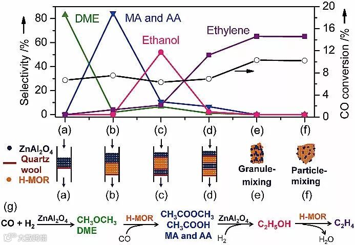 该研究进一步发现,具有尖晶石结构的ZnAl2O4复合氧化物与H-MOR组合(ZnAl2O4│H-MOR),在340-370 ºC的较高的温度下可催化合成气高选择性制备乙酸甲酯和乙酸。CO为11%时,乙酸甲酯和乙酸的总选择性达到87%。非常有趣的是,利用具有三明治构型的ZnAl2O4│H-MOR│ZnAl2O4催化剂组合,合成气可直接转化为乙醇,乙醇选择性达52%(图3),由此表明在该组合下游的ZnAl2O4上发生了乙酸甲酯的氢化反应,生成乙醇。他们利用层-层重叠的ZnAl2O4│H-MOR│ZnAl2O4│H-MOR催化剂组合,从合成气可直接制备乙烯,乙烯的选择性约50%,因此在进一步添加的H-MOR层上发生了乙醇脱水反应。将ZnAl2O4与H-MOR直接混合,拉近两者的接触距离,乙烯选择性可进一步提升至65%,C2-C4低碳烯烃的选择性接近80%。因此,通过改变ZnAl2O4与H-MOR两大活性组分的排列方式,他们成功实施了接力催化反应,从合成气直接获得乙酸甲酯、乙醇或乙烯。