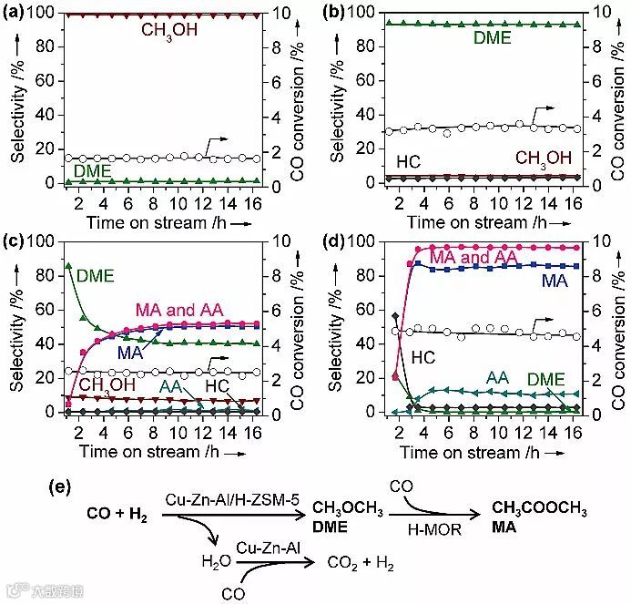 图2. 利用催化剂组合,实现合成气转化制乙酸甲酯以及乙酸甲酯的生成路径。(a) Cu-Zn-Al 催化剂;(b) Cu-Zn-Al/H-ZSM-5催化剂;(c) Cu-Zn-Al│H-MOR组合;(d) Cu-Zn-Al/H-ZSM-5│H-MOR组合。