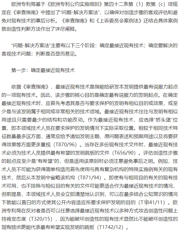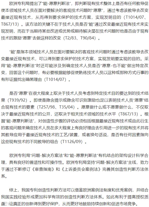 欧洲专利局在专利制度建设方面处于全球前列,已经形成了科学、有效、完整的创造性判断方法体系,欧洲专利局的创造性判断方法对我国专利创造性判断方法具有重要的借鉴意义。