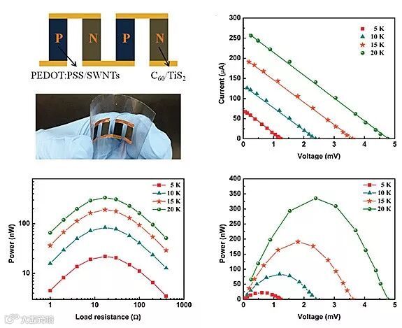 该方法制备的C60/TiS2复合膜表现出优异的热电性能:其ZT值在室温下可以达到~0.2,400 K时可以达到~0.3,和已报道的单晶TiS2性能相当,且高于现有溶液制备的柔性N型热电材料。使用该复合材料打印的热电器件在温度梯度为20 K时,最大输出功率可达到1.68 W/m2。
