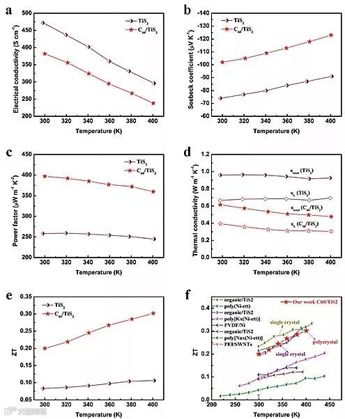 C60纳米颗粒的插层不仅提高了该复合材料的功率因子,同时由于声子散射效应,TiS2的晶格热导也显著降低。显著降低的热导来源于TiS2和C60的共同作用:TiS2纳米片可以有效地散射长波声子,小尺寸的C60纳米颗粒更倾向于散射中等波长和短波长的声子。