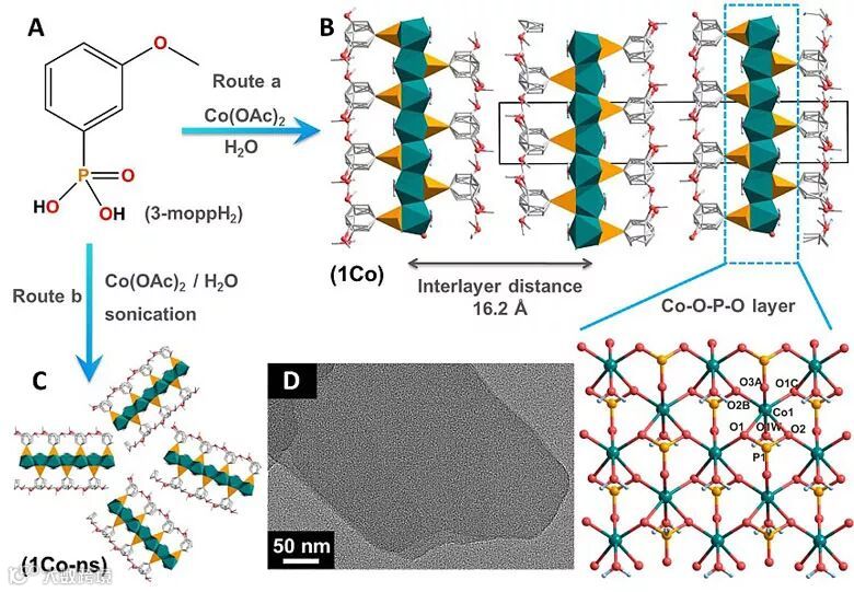 最近,南京大学化学化工学院的郑丽敏教授课题组与夏兴华教授课题组合作,在金属有机磷酸片层材料的研究中取得重要进展。受自然界中酶活性中心能级的调控及其催化位点配位环境构建的启发,他们设计了一种有机磷酸钴配位聚合物(coordination polymer,CP)纳米片层材料,提出一种结合“自下而上”和“自上而下”的制备方法(a combined bottom-up and top-down methodology),在室温的水溶液体系中通过磷酸基团有机物((3-methoxyphenyl)phosphonic acid,简化为3-moppH2)和钴盐(醋酸钴,Co(CH3COO)2)在超声环境下的直接自组装,大规模制备出超薄的Co(3-mopp)(H2O)纳米片结构(简称1Co-ns)。