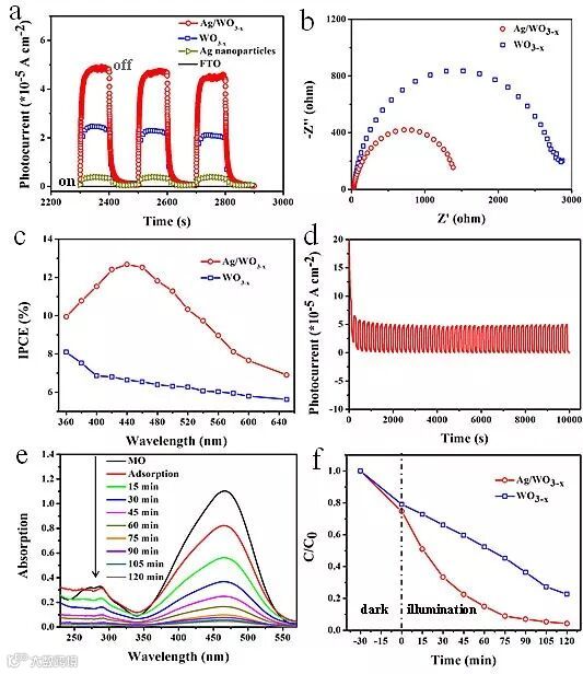 最近,郑州大学资源材料学科的许群教授课题组首次通过二氧化碳构筑的微环境,成功制备出富含氧缺陷、结晶/非晶共存的二维富勒烯结构的三氧化钨(WO3-x),并在此基础上制备了等离子体激元的金属Ag纳米粒子负载的新型等离子体光电极Ag/WO3-x,高效实现了PEC水分解。PEC性能的增强主要取决于以下因素:(1)2D富勒烯结构的WO3-x纳米片提供了大比表面积;(2)2D富勒烯结构的WO3-x纳米结构中结晶和非晶区之间的界面处形成导电通道,保证实现高载流子浓度和迁移率,并有效促进电荷分离和电荷的快速转移;(3)作为光吸收剂的等离子体Ag纳米粒子在LSPR过程中激发产生电子空穴对;(4)等离激元产生Ag纳米粒子的热电子有效地转移到WO3-x纳米片上,并由于Ag和WO3-x界面处的肖特基势垒帮助热电子在WO3-x中积累,并抑制其返回。