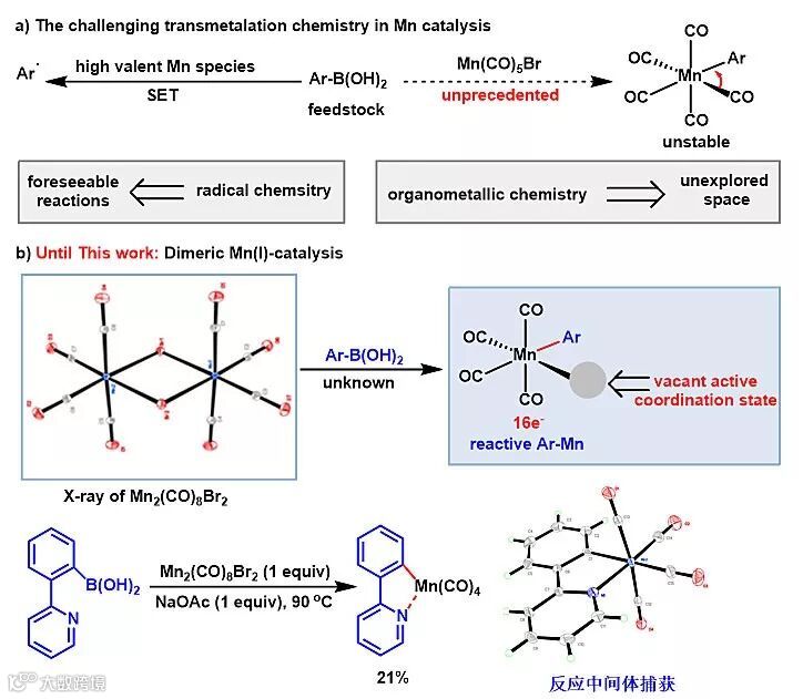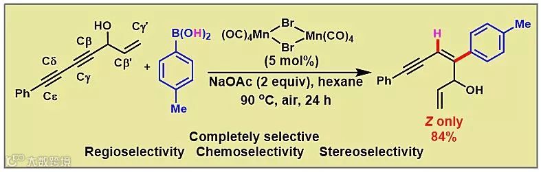 芳基硼酸具有特异的反应活性、稳定性、易得性、易操作性,是一类非常重要并有着广泛合成应用的芳基源。由于非螯合的多羰基芳基Mn化合物活性非常高,容易发生分子内的迁移重排反应;而高价Mn催化剂容易与芳基硼酸发生单电子氧化形成相应的芳基自由基。因此,Mn催化的芳基硼酸在有机合成中的应用仍然是Mn催化领域的一大挑战。谢劲、朱成建研究团队提出了通过双核Mn催化产生更高活性的芳基锰物种,直接与1,3-共轭二炔配位,实现了区域、立体和化学选择性氢芳化反应,成功完成了(Z)-构型共轭炔烯的制备(Scheme 1)。