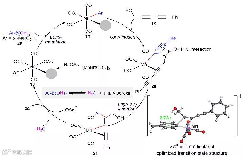 基于实验现象和一系列机理研究,作者提出了一种可能的机理。首先,在NaOAc存在下,Mn2(CO)8Br2催化剂形成活性Mn(I)物种18,然后与芳基硼酸2a进行转金属化,生成Ar-Mn中间体19,高活性空配位的Ar-Mn中间体19和1c配位形成复合物20,1c中的羟基与Ar-Mn中的芳基之间的弱O-H...π相互作用促进β-C选择性,将邻近羟基的炔烃顺式插入到Ar-Mnσ键可以得到中间体21,炔基可以通过共轭效应稳定该中间体。最后,在三芳基环硼氧烷物种形成过程中产生的H2O与中间体21质子去金属化重新生成活性Mn(I)物种18和共轭炔烯3c,然后反应循环进行(Scheme 5)。