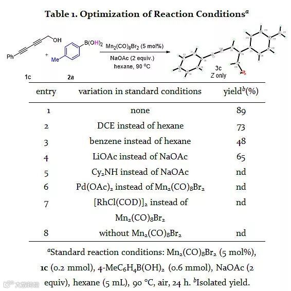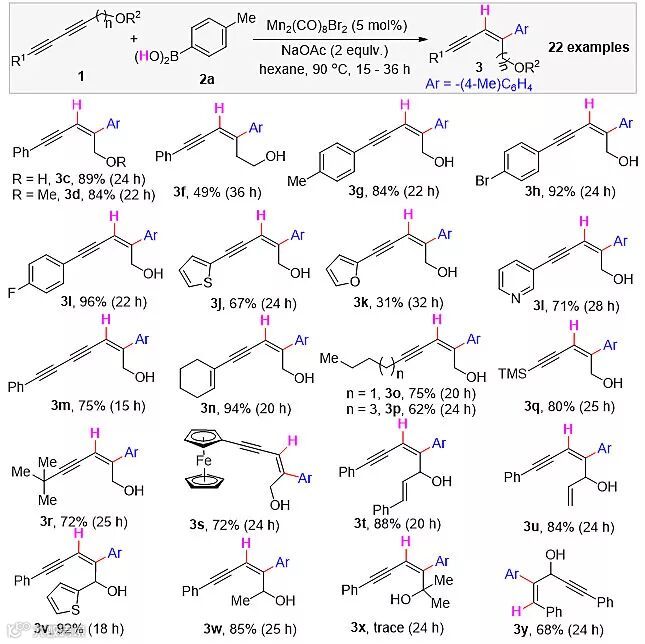 接下来,作者以二炔醇1c和对甲基苯硼酸2a作为模板反应进行了条件的筛选与优化,用Mn2(CO)8Br2作为催化剂,NaOAc作为碱,正己烷作为溶剂,在90 °C的条件下最终以 89 %的收率得到了单一区域、立体和化学选择性的(Z)-构型加氢芳构化产物。Pd(OAc)2和[RhCl(COD)]2均不能得到目标产物,也证明了Mn2(CO)8Br2作为催化剂的优越性(Table 1)。
