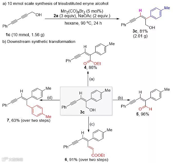 该反应同样可以适用于克级反应且产率不受影响,为后续工业化生产提供一种可能。反应产物也可以进行多样化转化,快速以高产率转化成对应的酯、醛、共轭二烯等其它有用的化合物(Scheme 4)。
