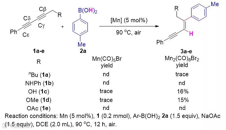 首先,作者考察了几个带有不同官能团的取代1,3-共轭二炔来研究底物类型的适用性,发现二炔醇1c及二炔醚1d可以在β-碳上进行芳基化反应,得到加氢芳构化产物3c和3d,其它取代基的二炔则不能进行反应。用Mn(CO)5Br作为催化剂只能得到痕量产物,可以看出,Mn2(CO)8Br2 是比Mn(CO)5Br更有效的催化剂(Scheme 2)。