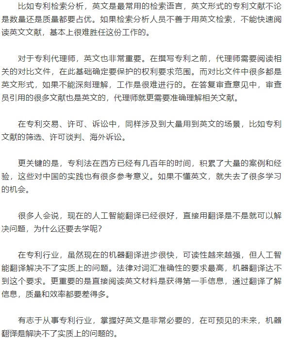 行业来说,英语至关重要。虽然目前的专利代理师考试不考英文,但从事这一行的人都应该清楚,英文不好,在专利行业会很受限的。