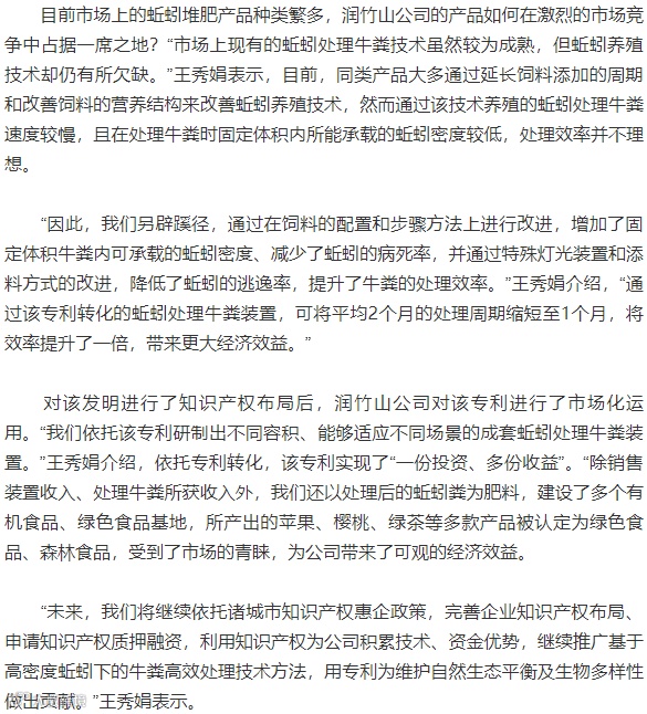 王秀娟口中的专利产品,是润竹山公司已获授权的发明专利“一种基于高密度蚯蚓下的牛粪高效处理方法”。据诸城市知识产权事业发展中心主任武培锋介绍,该中心在润竹山公司发展前期便派遣知识产权领域专家,“手把手”地帮助润竹山公司挖掘牛粪高效处理方法的技术价值,并协助该公司提交专利申请,用知识产权保护创新成果。在此基础上,润竹山公司通过进行技术研发、布局专利并实现产业化,为改善生态环境、促进农牧循环、打通畜禽粪污的资源化利用“最后一公里”,贡献了专利的力量。