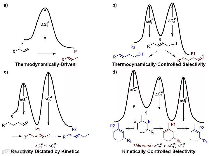 烯烃的异构化反应是有机合成中一类非常重要的反应。该方法既可用于高效制备其他方法难以直接合成的内烯烃产物,又可通过碳-碳双键这一高反应活性官能团在底物上的迁移过程最终实现底物分子中初始碳-碳双键远端位点的官能化反应。如图1a所示,所有的烯烃异构化反应都是热力学驱动的反应转化。尽管目前已经发展了许多高效的催化体系可用于烯烃的异构化反应,但是选择性的控制仍然是此类反应的难点所在。热力学控制的反应选择性调控相对容易,例如烯丙基醇的异构化反应(图1b),只要双键在碳链上的迁移过程是迅速且可逆的,那么反应的主要产物必然是热力学更稳定的醛类化合物。而在实际的合成工作中,异构化反应的目标产物不一定是热力学最稳定的烯烃异构体,这类反应的选择性调控更加困难。例如,在1-烯烃至2-烯烃的选择性转化(图1c)反应中,双键可能继续发生迁移,生成能量相近的其他烯烃异构体。要想控制反应的2位选择性,催化剂必须能够区分1-烯烃和2-烯烃在反应活性上的差别,使反应的活化能ΔG≠1<ΔG≠2,目前可高效地实现该选择性调控的催化剂鲜有报道。最近,清华大学化学系的刘强课题组和焦雷课题组合作发展了一类钴催化动力学控制的选择性烯烃异构化反应。在此工作中,作者系统研究了1,1-双取代烯烃的异构化反应(图1d),当反应底物中有两个可能的反应位点a、b时,碳-碳双键能够高选择性地迁移至位阻较小的a端。要有效调控这类反应的选择性,就要求所使用的催化剂不仅具有高反应活性,还能够非常精准地识别底物上R基团所引起的微小位阻的效应差异,使反应的活化能ΔG≠2<ΔG≠1, ΔG≠3无疑更加具有挑战性。