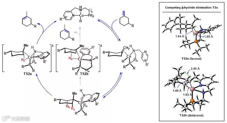 在实验研究的基础上,作者提出了金属氢迁移插入/β-H消除的反应机制(图三),其中β-H消除步骤决定了异构化反应的区域选择性。结合DFT计算,作者对β-H消除过程两种可能的过渡态结构(TS2a及TS2b)进行分析。在TS2b中,配位的吡啶基团和底物分子的间位取代基团R存在排斥作用,而这种相互作用在优势过渡态TS2a中不存在,从而解释了配体效应如何实现反应区域选择性的调控。