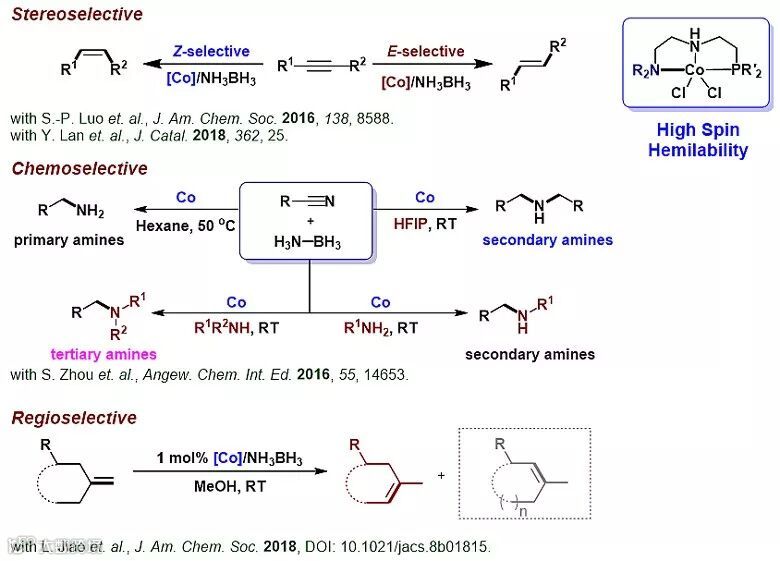 经过两年多的努力,刘强课题组发展的高自旋钳形钴络合物实现了能源小分子氨硼烷的高效催化活化,可用于立体选择性的炔烃转移氢化反应,高选择性地制备出(Z)-烯烃和(E)-烯烃以及实现化学选择性的氰基转移氢化反应、高选择性地合成一级胺、二级胺和三级胺类化合物;还可以实现区域选择性的烯烃异构化反应,得到双键迁移至位阻较小一侧的内烯烃产物。