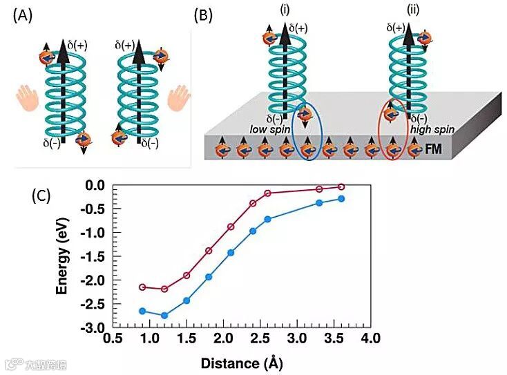 以上实验证明铁磁体与磁场共同作用能选择性地分离手性分子,作者对此现象进行了解释。在铁磁体诱导的电偶极子极化条件下,分子的正负极分别有多余的空穴和电子,这种电荷极化伴随着自旋极化(spin polarization),正负极上的特异性自旋取向依赖于分子的手性(图5A)。如果手性分子的自旋与铁磁体基底的自旋存在交换作用,即它们中的电子自旋相互反平行,则它们将共享一个轨道,增加静电库仑能,分子-基底相互作用较稳定;然而,若二者的自旋平行,根据泡利不相容原理,二者形成分开的轨道,减少库仑相互作用,分子-基底相互作用较不稳定(图5B)。如果这种作用力足够大,就能够通过控制手性分子的运动达到分离手性分子的目的。作者还以氢原子和镍(铁磁体)为模型,利用密度泛函理论(density functional theory,DFT)研究了该相互作用能。