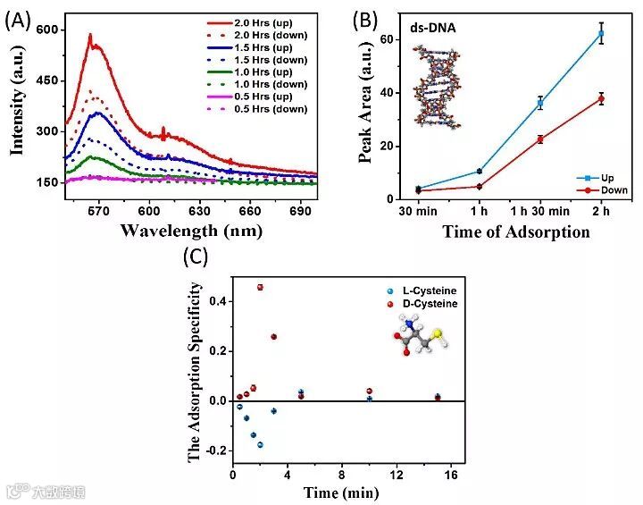 接着作者研究了这种方法(铁磁体由钴换成镍)对双链DNA(20个碱基对)的影响,DNA的一端连有Cy3荧光染料,当DNA固定到金层上时可以检测到荧光。作者研究了在磁场方向竖直向上或者向下时金表面荧光强度与吸附时间的关系(图4A和4B)。结果证明,在不同的磁场方向作用下,双链DNA吸附到金表面的速率有很大差别。除了研究该方法对低聚肽和DNA的影响之外,作者还研究了对小分子(半胱氨酸)的影响(图4C)。可见对半胱氨酸分子的吸附在短时间内具有一定的对映选择性,随着时间增加吸附的对映选择性消失。