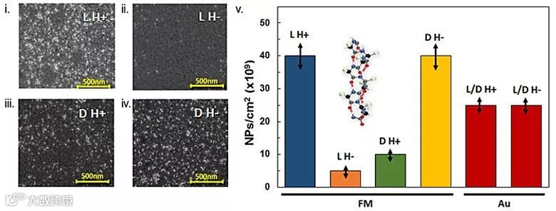 磁性和手性到底有没有关系?这个问题的历史已经超过一个世纪。在显微镜下成功分离手性酒石酸盐晶体的著名科学家巴斯德,就曾希望在磁场的作用下合成出只有一种手性的物质,但是没有成功。近来的研究表明,当电子在手性分子中运动时,它们的输运与自旋相关,首选的自旋取向取决于分子的手性和运动的方向。受此启发,Naaman教授和Paltiel教授研究团队预测手性诱导的自旋选择性有助于手性识别。随后他们设计实验以证明自己的猜想。以钴薄膜作为铁磁体(FM)基底,并在其上沉积一层金(厚度5 nm)。金不仅可以防止钴的氧化,还能固定含有巯基的分子,也不会影响铁磁体的磁性质和自旋输运性质。分离的目标物是基于L-和D-聚丙氨酸(PAL)的α螺旋低聚肽,具有稳定的螺旋结构,末端有巯基可以与铁磁体表面的金结合。二氧化硅纳米颗粒作为扫描电镜下的标志物,可连接到PAL低聚肽的另一端,帮助表征该低聚肽的吸附情况。当铁磁体基底磁化方向竖直向上(H+)和向下(H-)时,L-PAL在基底上的吸附情况有明显区别(图3i和ii),D-PAL在基底上的吸附情况也有明显区别(图3iii和iv)。从图3i至从图3iv,铁磁体基底的金表面吸附的二氧化硅纳米颗粒密度分别是(4 ± 0.4) × 1010 NPs/cm2、(6 ± 1) × 109 NPs/cm2、(1 ± 0.2) × 1010 NPs/cm2和(4 ± 0.5) × 1010 NPs/cm2。这些数据表明,该方法能够影响L-PAL和D-PAL在铁磁体基底金表面的固定,表现出了良好的对映选择性。而将铁磁体去掉使用纯金基底时,磁场不会对L-PAL和D-PAL的吸附过程产生影响(图3v)。另外,当时间足够长时,无论磁场竖直向上或者向下,铁磁体基底金表面吸附的二氧化硅纳米颗粒的量都基本一样,这是因为这两种分子与金的结合能相同,而磁场和铁磁体只是阻碍了手性分子向金层的运动。