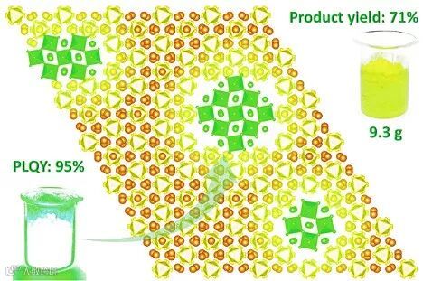 三卤钙钛矿材料具有优异的发光特性,在白光LED方面表现出良好的应用前景。其中,卤化铅铯(CsPbX3,X=卤素离子)钙钛矿纳米晶由于具有高荧光量子效率、窄带发光峰、合成方法简单等优点而备受关注。但是,大多数报道的方法适用于实验室规模的CsPbX3纳米晶合成,因此大大限制了其工业规模化生产。其次,CsPbX3纳米晶的稳定性远低于市售荧光粉的稳定性。另外,相比于分散性良好的纳米晶胶体溶液,CsPbX3纳米晶团聚时发光效率会显著降低。