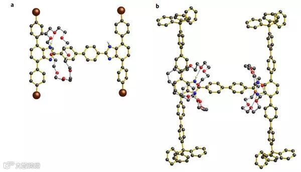 研究者由使用1H和13C核磁共振以及高分辨率质谱分析了所得[2]轮烷和[3]轮烷,同时他们使用单晶X射线衍射来验证结构。四溴[2]轮烷[3⊂(24C8)]的结构如图3a所示,轴上只有一个大环;而带电荷的饱和[3]轮烷[4-H2(24C8)(B30C8)][BF4]2的结构如图3b所示,它包含两个不同大小的环,较小的24C8在右,而较大的B30C8在左。