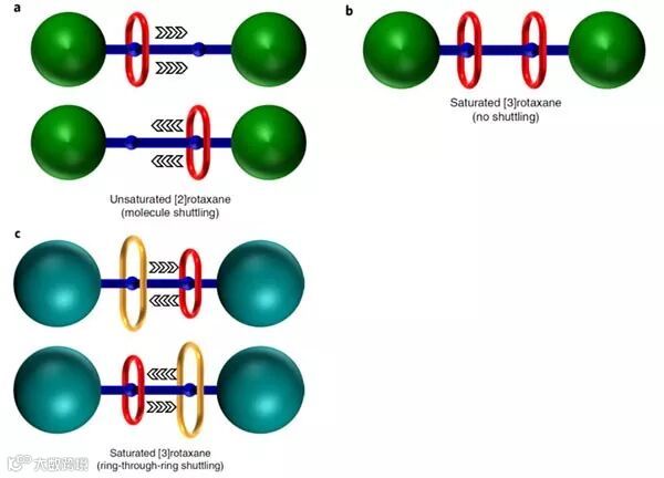 分子拓扑学和机械键为人们提供了一套结构工具来创造纳米级的“分子机器”,而分子机器也为三位化学家赢得了2016年的诺贝尔化学奖。其中,J. Fraser Stoddart教授的获奖与他在“分子梭(molecular shuttle)”领域的研究贡献密不可分。1991年,Stoddart教授合成了第一个[2]轮烷([2]rotaxane)分子梭,这种机械互锁分子(mechanically interlocked molecule,MIM)包括一个线性的轴和套在上面的大环,大环在轴两端之间的识别位点上来回移动(即“梭动”,图1a),这种大幅度的平移运动可以被外部刺激所控制。在此基础上,机械互锁分子还衍生出了分子开关、分子肌肉、分子升降机等等。轮烷的分子轴上也可以“套上”两个甚至更多的分子大环,这种情况下,如果轴上没有“空置”识别位点,这些环就无法来回移动,例如饱和[3]轮烷(图1b)。