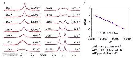 为了更深入地了解这种分子梭动现象,研究者对这些[2]轮烷和[3]轮烷在不同溶剂中(甲苯-d8和 DMSO-d6)进行了变温1H NMR 实验。在低温下,[3]轮烷[4⊂(24C8)(B42C8)]中的平移运动(交换)的速度十分缓慢,导致两个被占据的识别位点的峰清晰可辨。随着温度的升高,两个峰逐渐变宽、融合并最终在高于室温的情况下成为单峰(图5a)。研究者认为,这表明在更高的温度下,轴上的大环和小环能够在两个苯并咪唑识别位点上进行快速的梭动,速度快于NMR的检测时间。这种情况,唯一合理的解释就是小环穿过了大环,进行“环穿环”分子梭动。研究者还估算了[3]轮烷[4⊂(24C8)(B42C8)]的“环穿环”分子梭动的速率和能垒(图5b)。此外,如果用酸处理[4⊂(24C8)(B42C8)]以形成[4-H2(24C8)(B42C8)][BF4]2,“环穿环”分子梭动仍然可以被检测到,只是速度较慢。研究者认为,中性轮烷的分子梭动速率要比带电荷的轮烷快得多,这是由于当轴带电荷时,轴和环之间的非共价相互作用会增强;此外,“环穿环”分子梭动比单个环在两个识别位点之间穿梭要更慢更困难,这是由于当一个环穿过另一个环时需要额外的能量。