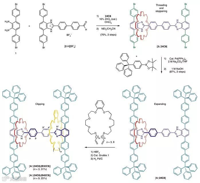 这种新型分子梭主要包含刚性H形轴,两个苯并咪唑识别位点和两个聚醚大环:其中一个较小,[24]冠-8(24C8);另一个较大,苯并[n]冠-8,其中n为30(B30C8)或42(B42C8)。在一锅反应中,含有末端醛官能团的预形成的准轮烷[2-H⊂24C8]+与二胺1以等当量缩合,然后在催化剂ZrCl4存在下氧化,用Et3N处理后,得到中性的四溴[2]轮烷[3⊂(24C8)]。因为[3⊂(24C8)]还包含一个未被占用的识别位点,更大的环可以被添加上去,但是这就要求需要延长轴并增加两端封基(stopper)的尺寸,以确保更大的环能被限制在轴上而不会滑落。研究者通过Suzuki偶联反应,在四溴[2]轮烷[3⊂(24C8)]的封基上引入更大的三苯甲基基团得到[2]轮烷[4⊂(24C8)],并且保持与之前[2]轮烷[3⊂(24C8)]相同的MIM特征。最后研究者通过关环复分解反应将双烯烃大环前体“套到”轴上剩下的识别位点上,得到了他们想要的饱和[3]轮烷分子[4⊂(24C8)(B30C8)]和[4⊂(24C8)(B42C8)]。