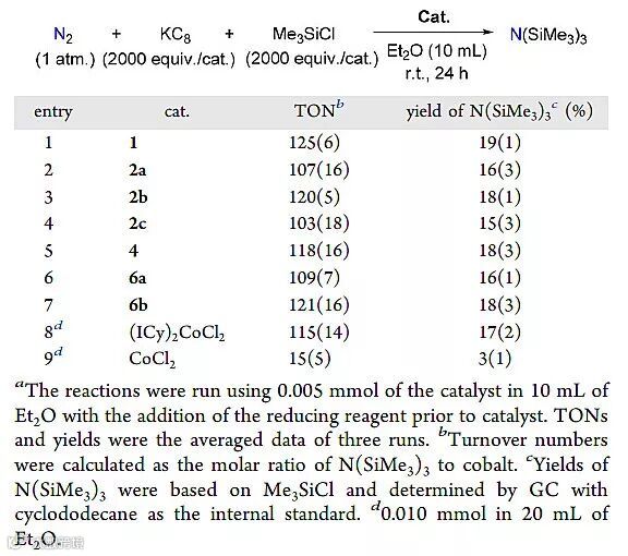 图3. 氮杂环卡宾钴配合物催化氮气分子转化为N(SiMe3)3