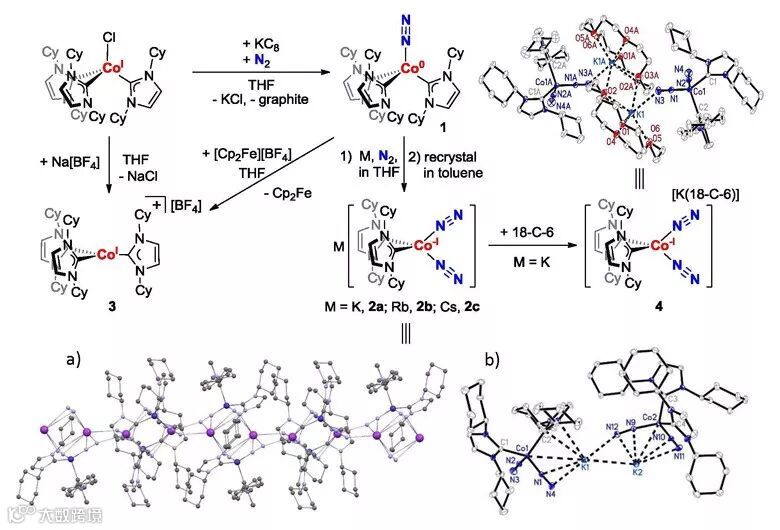 作者首先从配合物[(ICy)3CoICl]出发,经依序还原分别实现了零价钴分子氮配合物[(ICy)3Co0N2](1)和负一价钴双(分子氮)配合物M[(ICy)2Co-I(N2)2](M = K,Rb,Cs)(2a-c)的合成,配合物2a-c是首例报道的钴双(分子氮)配合物。分子结构表明,配合物2a-c在固相下呈现出聚合物链状,钴中心氮气分子的氮-氮键长为1.145(6)−1.162(5) Å(自由氮气分子:1.0975 Å);红外光谱表明,配合物2a-c中氮气分子的氮-氮键伸缩振动频率分别处于1800和1900 cm-1左右(自由氮气分子:2331 cm-1)。这些数据表明,在配合物2a-c中,钴中心对氮气分子具有较强的活化作用。配合物2c与18-冠醚-6反应也可以转化为单体钴双(分子氮)配合物[(ICy)2Co(-I)(N2)2][K(18-C-6)](4)。在质子酸(HCl或TfOH)的作用下,配合物2a-c和4中的氮气分子可以部分选择性地转化为肼(N2H4),产率为24-30%(相对于钴)。值得一提的是,配合物1经[Cp2Fe][BF4]氧化后发生氮气分子的消除,形成一价钴配合物[(ICy)3Co(I)][BF4](3),该反应也进一步说明了电负性较大的钴中心在氮气分子配位及活化中的挑战。