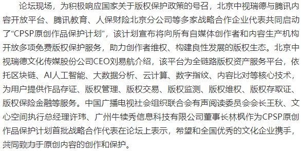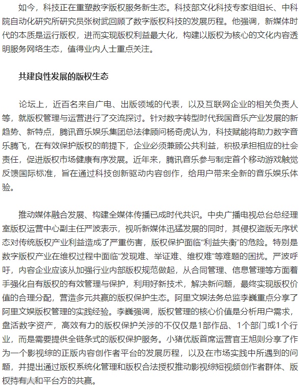 5月22日,2021版权管理与运营高峰论坛在京举办。今年是“十四五”开局之年,也是中国共产党建党100周年,新修改的著作权法将于6月1日起实施。站在历史新起点上,如何推动我国版权事业再上新台阶,对于推动高质量发展、构建新发展格局至关重要。当前,知识产权正逐步发展成为我国企业发挥核心竞争力的重要工具,面向未来,如何在加强行业各部门协同合作的基础上,进一步推动自主创新,用新技术开创知识产权保护新局面,备受业界关注。此届论坛由国家版权交易中心联盟主办、北京中视瑞德文化传媒股份有限公司承办,聚焦数字转型时代我国知识产权保护的最新动态和行业现状,围绕“版权管理、版权运营、版权保护、内容创作者生态”等议题进行了深入探讨。