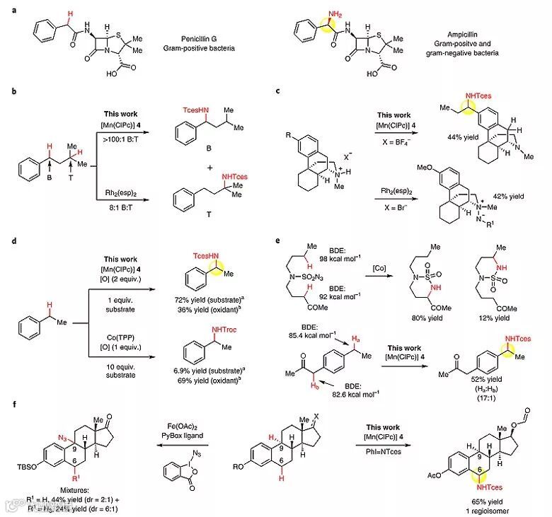 Christina White教授团队报道了多氯酞菁锰[MnIII(ClPc)]催化分子间高选择性的苄位C(sp3)-H键胺化反应。锰催化剂4可通过廉价易得的原料,以一步反应大量合成。该反应具有良好的官能团兼容性,底物中修饰其他含氮官能团如三级胺、吡啶和苯并咪唑等也可以顺利地参与反应,对实现复杂天然产物分子及生物活性分子的后期C-H键胺化具有重要的意义。