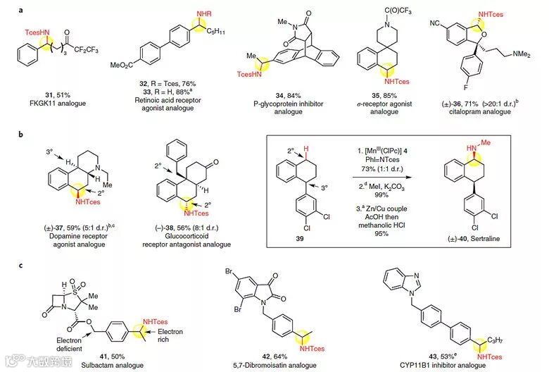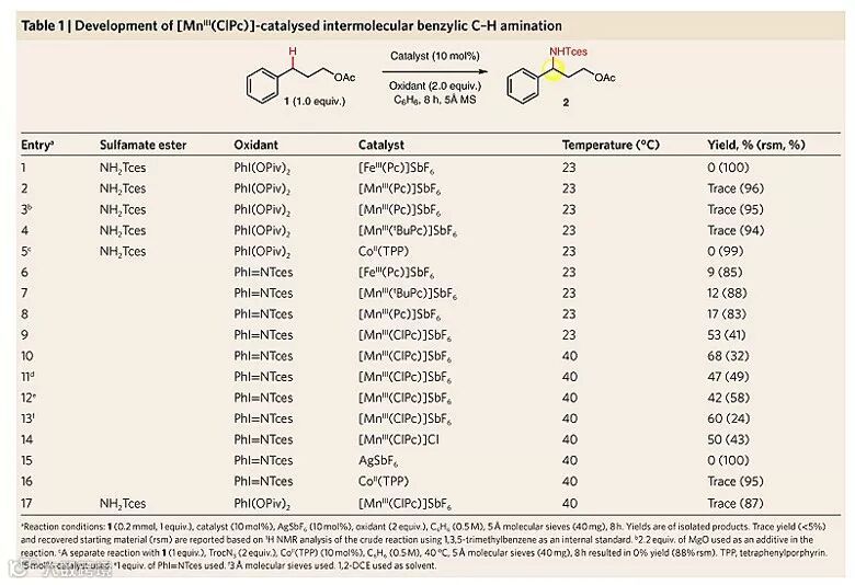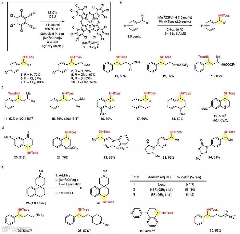 作者以乙酸苯丙酯1作为模板底物,对一系列以往用于分子内C-H键胺化反应的第四周期过渡金属催化剂进行考察,发现当使用多氯酞菁锰[MnIII(ClPc)] 4(4 = [MnIII(Cl16Pc)]SbF6,图4a)作为催化剂、PhI = NTces作为胺化试剂时,分子间的C-H键胺化反应能够顺利地进行。反应中非配位的SbF6-阴离子对于提高过渡金属阳离子的亲电活性具有重要的作用,吸电子特性的配体可辅助亲电性的金属氮宾形成,从而实现分子间的C-H键胺化。最终他们以苯作为溶剂,并加入5 Å分子筛作为添加剂,反应在40 ℃的条件下进行,以68%的产率得到苄位氨基化的产物。