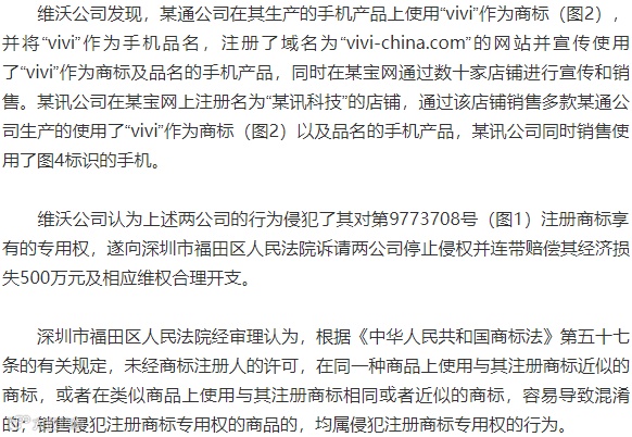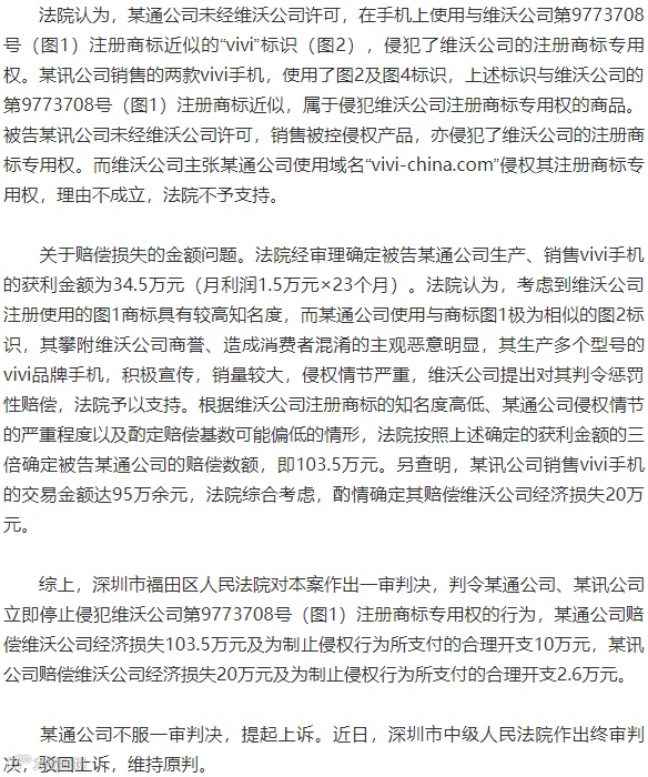 近日,广东省深圳市中级人民法院对维沃移动通信有限公司(下称维沃公司)诉深圳市某通电子科技有限公司(下称某通公司)、 深圳市某讯科技有限公司(下称某讯公司)侵犯商标专用权案作出终审判决,判决维持原判,即“vivi”商标侵犯了维沃公司“vivo”商标的专用权。