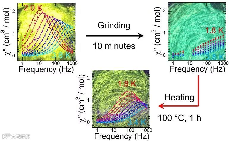晶体材料的研磨会破坏分子间的堆积结构,从而引起发光颜色的变化,而且加热条件下部分材料能实现堆积结构的恢复,从而实现可逆的研磨变色发光。无独有偶,单离子磁体的磁弛豫行为对自旋金属中心的配位环境非常灵敏,研磨相变必然导致磁弛豫行为的改变。因此,南京大学化学化工学院的郑丽敏教授课题组将研磨发光变色行为引入单分子磁体中,利用蒽环配体构筑了两种单核镝配合物。对比发现,具有大量π-π堆积作用的化合物(上图,左)能很好地实现研磨变色发光和研磨磁弛豫行为的调控(下图),同时存在光致诱导发光变色行为。而仅存在C-H⋯π作用的化合物(上图,右)对研磨行为的响应不太灵敏。这一研究结果为发展磁光双功能的存储技术拓宽了研究思路。