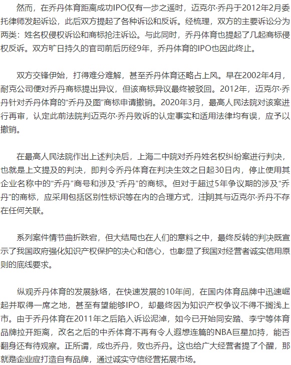 不久前,上海市第二中级人民法院(下称上海二中院)对涉NBA巨星迈克尔·乔丹姓名权纠纷案做出一审判决,认定乔丹体育股份有限公司(下称乔丹体育)构成侵权,应当停止使用其企业名称中的“乔丹”商号和涉及“乔丹”的部分商标。近日,乔丹体育正式更名为中乔体育股份有限公司(下称中乔体育)。至此,双方持续近10年的系列争议落下帷幕。